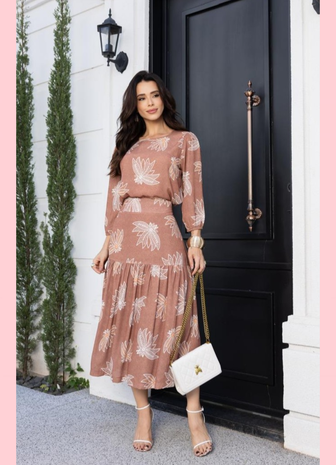 O Conjunto Márcia é uma opção elegante e confortável com saia  feita em tecido crepe georgette forrada. Disponível nos tamanhos M (38-40) e G (42-44), garante leveza e caimento fluido para o dia a dia ou ocasiões especiais.